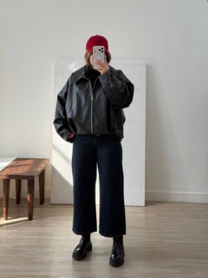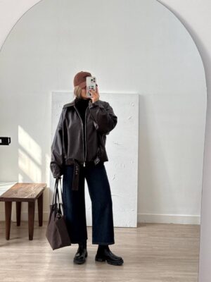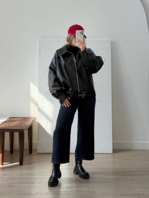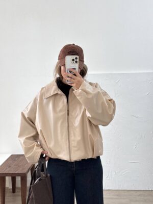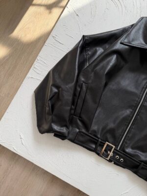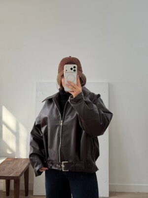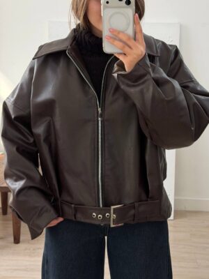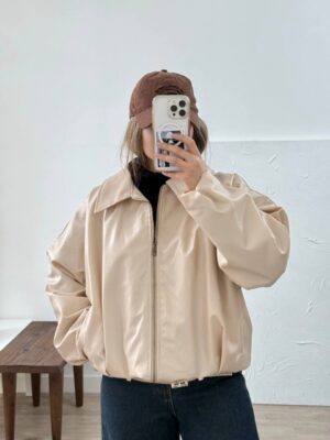 مشابه جکت چرم از برند پول اند بیر / جنس رویه چرم باکیفیت/ دوجیب کاربردی داره / کمربند خور/ استایل باکسی
