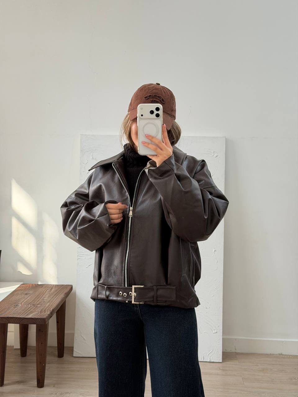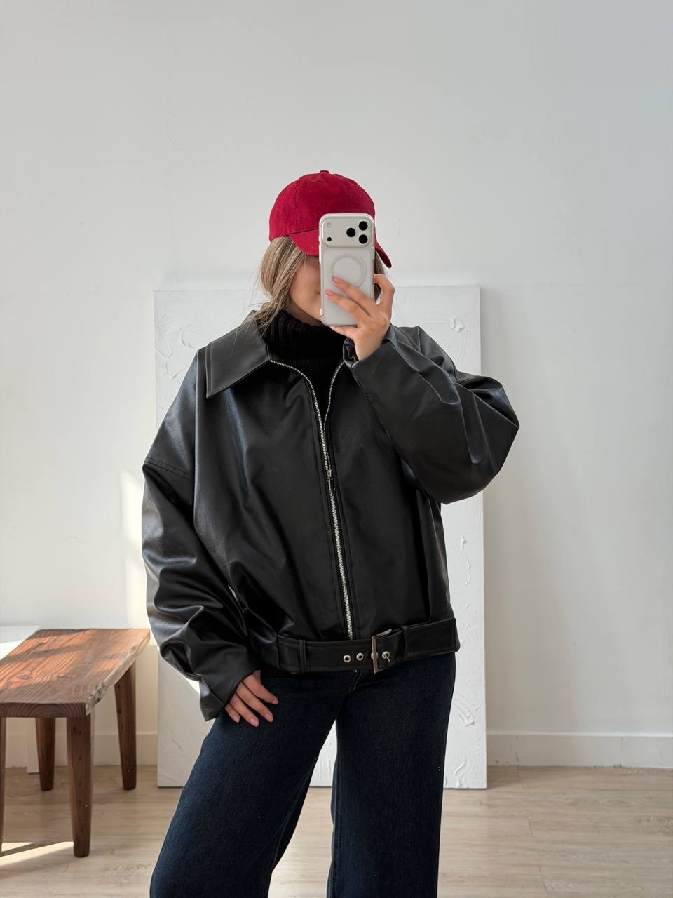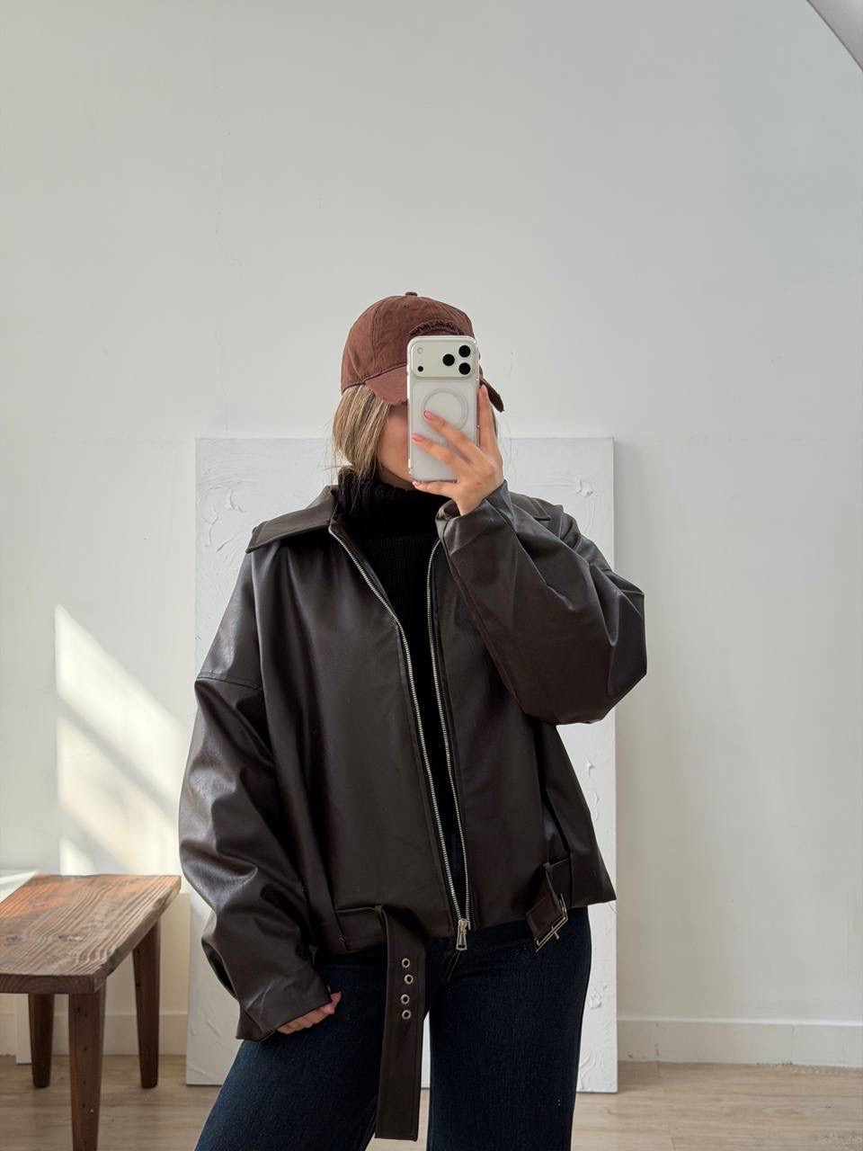 مشابه جکت چرم از برند پول اند بیر / جنس رویه چرم باکیفیت/ دوجیب کاربردی داره / کمربند خور/ استایل باکسی